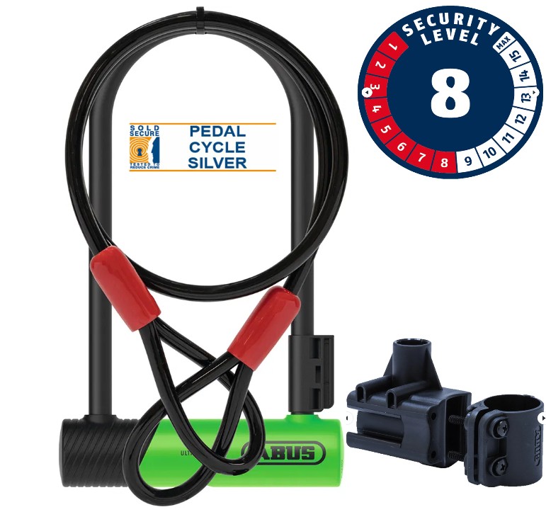WITH ITS SOLID CONSTRUCTION AND HIGH-QUALITY LOCK CYLINDER, THE U-LOCK OFFERS ROBUST SECURITY, WHICH IS ALSO CONFIRMED BY THE SOLD SECURE SILVER TEST SEAL. THANKS TO THE SUPPLIED SH34 HOLDER, THE U-LOCK CAN BE CONVENIENTLY AND EASILY TRANSPORTED ON YOUR BIKE WITHOUT ANY ANNOYING RATTLING. IN COMBINATION WITH THE COBRA CABLE, THE ULTRA 410K CAN ALSO BE USED TO SECURE OTHER COMPONENTS SUCH AS TYRES IN ADDITION TO THE BIKE FRAME. THE NEWLY DESIGNED LOCK BODY CASING COMBINES IMPROVED MATERIALS WITH PROVEN SIGNAL COLOUR OR IS AVAILABLE IN THE SPECIAL EDITION WITH THE NEW FLAKEBERRY PURPLE MATERIAL FINISH.