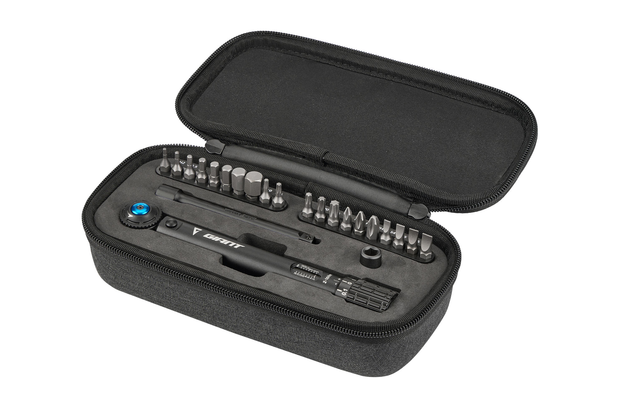 THE GIANT ADJUSTABLE TORQUE WRENCH OFFERS QUICK AND PRECISE TORQUE VALUE SETTING WITH AN AUDIBLE CLICK SOUND WHEN TORQUE IS REACHED. IT ALSO FEATURES A HANDY CARRYING CASE THAT INCLUDES A FULL TOOL KIT WITH HEX, TORX AND SCREWDRIVER BITS, HEX WRENCHES AND A SOCKET EXTENDER.