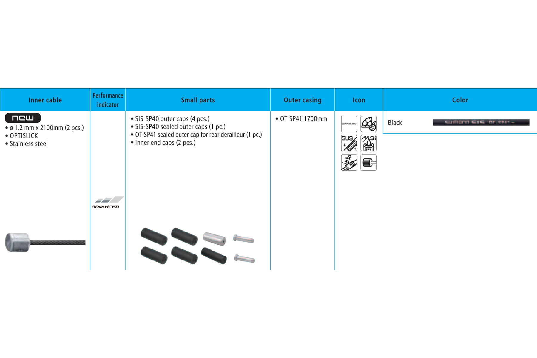 Includes 1.2 mm OPTISLICK inner wires (2 x 2100 mm) and SP41 outer casing for a complete bike (1 x 1700 mm) and all end caps