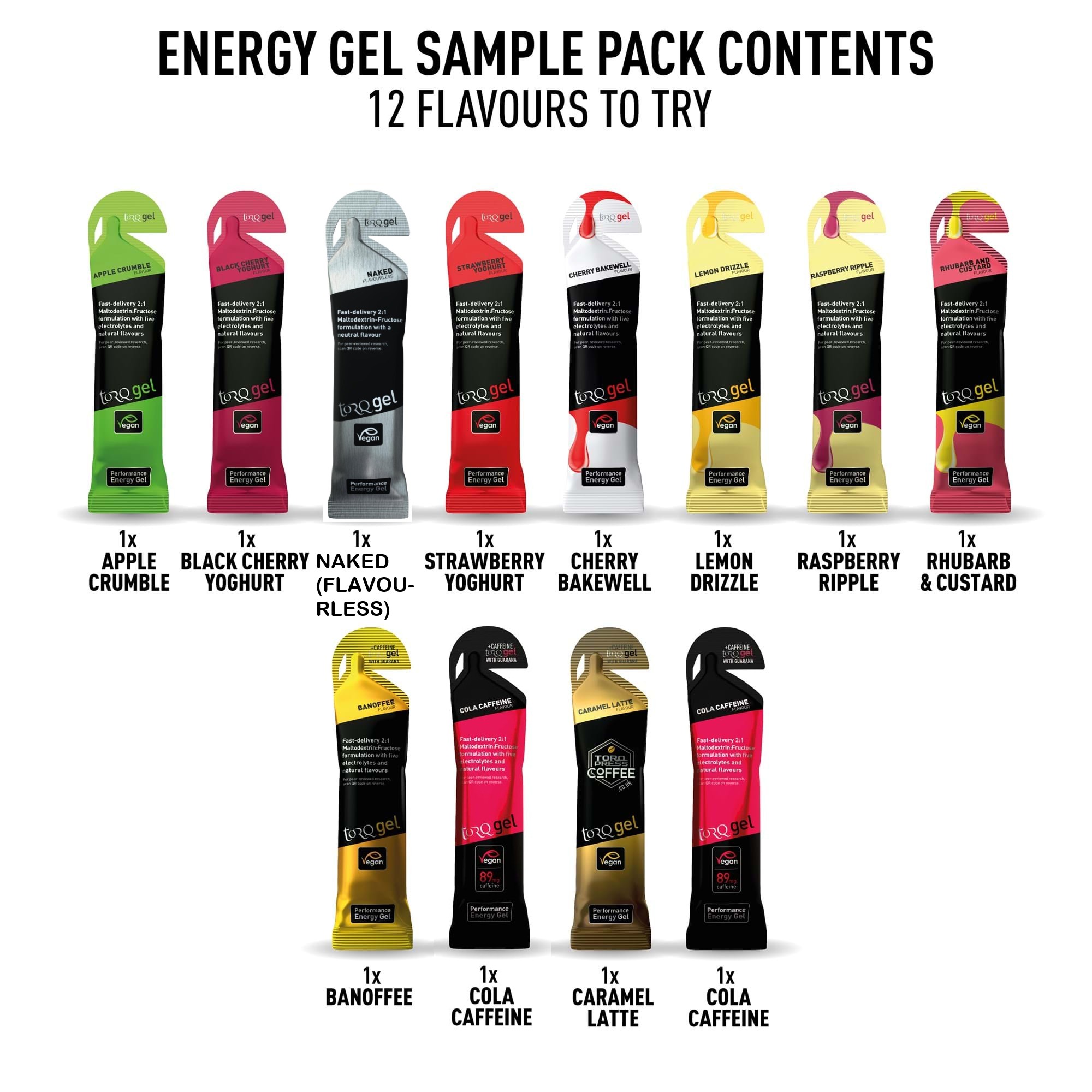 EACH TORQ GEL (WHETHER CAFFEINATED OR NOT) PROVIDES 30 GRAMS OF MULTIPLE-TRANSPORTABLE CARBOHYDRATES (1 TORQ UNIT), WHICH IS A SIGNIFICANTLY GREATER CONCENTRATION THAN MANY BRANDS ON THE MARKET TODAY FEATURED IN LARGER HEAVIER PACKAGES. FOR OPTIMAL PERFORMANCES, OUR TORQ FUELLING SYSTEM RECOMMENDS CONSUMING 2-3 TORQ UNITS PER HOUR WHICH CAN BE ACHIEVED THROUGH CONSUMING A VARIETY OF FUELLING PRODUCTS AS ILLUSTRATED IN THE TABLE BELOW. CONSUMING A TORQ GEL IS SIMPLY ONE METHOD OF INGESTING A TORQ UNIT.