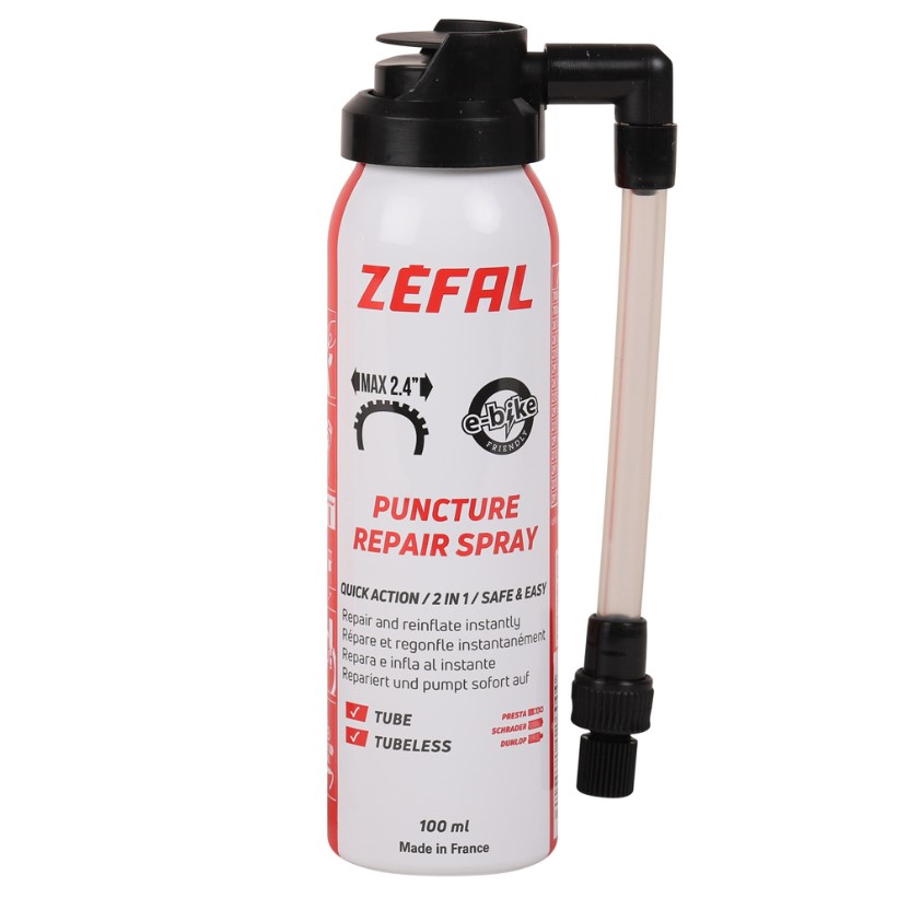 REPAIR SPRAY REPAIRS AND INSTANTLY RE-INFLATES FLAT TYRES WITHOUT HAVING TO CHANGE THE INNER TUBE. THIS TYPE OF RAPID AND SIMPLE FIX ALLOWS YOU TO CONTINUE YOUR RIDE WITHOUT HAVING TO DO A REPAIR. THE FIX ISN'T LONG-LASTING AS THE PRODUCT THAT IS INJECTED DRIES OUT IN A FEW DAYS. IT IS ADVISABLE TO CHANGE THE INNER TUBE OR TO REPAIR IT. THE REPAIR SPRAY BECOMES LESS EFFECTIVE AGAINST PUNCTURES LARGER THAN 2MM.